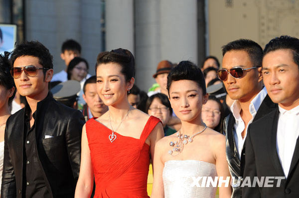 8月29日,演员黄晓明、李冰冰、周迅、张涵予、苏有朋(从左至右)走过红地毯。新华社记者 王芳 摄