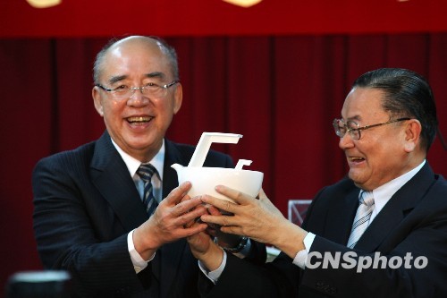 10月14日,中国国民党主席吴伯雄主持任内最后一次中常会后,出席国民党中央等举办的欢送茶会,接受由国民党秘书长詹春柏代表新主席当选人马英九致赠的瓷茶壶“海量”,感谢他的包容与大量。10月17日,国民党第18届全党代表大会将在台北县召开,新旧主席将进行交接。 中新社发 黄少华 摄