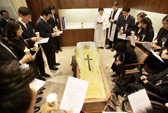 韩国前总统金大中的入殓仪式20日中午在首尔塞弗伦斯医院临时灵堂举行。