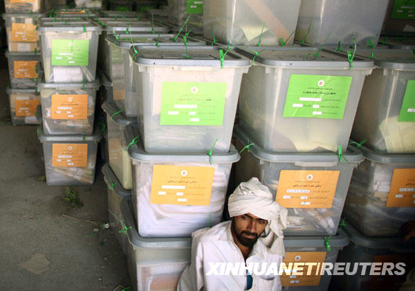 8月25日,在阿富汗首都喀布尔的阿独立选举委员会,一名男子在票箱前休息。新华社/路透