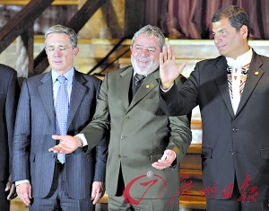 8月28日,哥伦比亚总统乌里韦(左)一脸疲惫。图为乌里韦、巴西总统卢拉(中)与厄瓜多尔总统科雷亚在南美洲国家联盟特别首脑会议上。