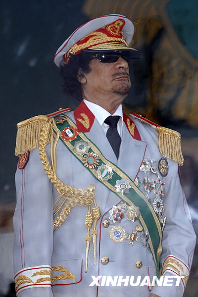 9月1日,在利比亚首都的黎波里,利比亚领导人卡扎菲检阅利比亚革命40周年阅兵仪式。新华社发(哈姆宰·图尔克摄)