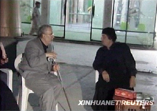这张8月21日的视频截图显示,利比亚领导人穆阿迈尔卡扎菲(右)在利比亚首都的黎波里与提前获释回国的洛克比空难制造者迈格拉希交谈。迈格拉希身患晚期前列腺癌,经过利比亚官员与苏格兰司法部门的协商,迈格拉希提前结束在苏格兰的刑期。美国白宫发言人吉布斯21日抨击利比亚方面为提前获释回国的洛克比空难制造者迈格拉希举行欢迎活动。新华社/路透