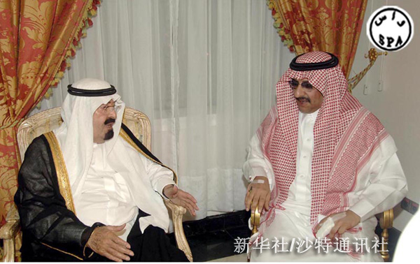 8月28日,沙特阿拉伯国王阿卜杜拉(左)在吉达医院探望负责安全事务的内政部次大臣穆罕默德·本·纳伊夫亲王。