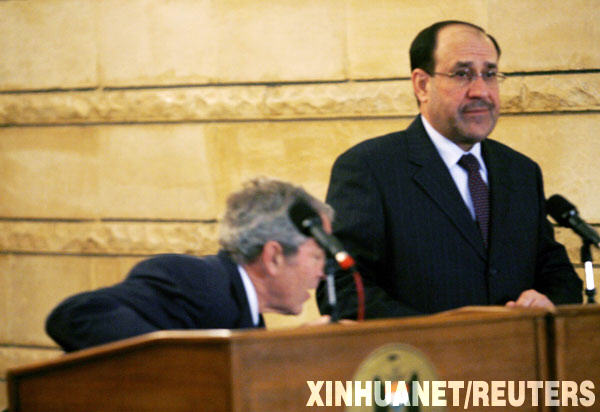 2008年12月14日,在伊拉克首都巴格达举行的记者会上,美国前总统布什(左)弯腰躲避袭击。当日,一名伊拉克记者在布什与伊拉克总理努里·马利基(右)召开的联合新闻发布会上脱下自己的鞋,扔向布什。 新华社/路透