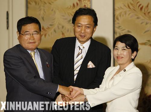 9月9日,日本民主党代表(即党首)鸠山由纪夫(中)、社民党党首福岛瑞穗(右)和国民新党代表龟井静香在日本首都东京握手。当天,在日本众议院大选中获胜的民主党与社民党和国民新党就三党联合执政达成了协议。新华社/路透