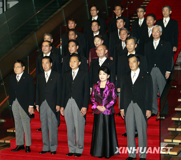 9月16日, 在东京首相官邸,新任日本首相鸠山由纪夫(前中)率内阁成员在媒体前集体亮相。当日,鸠山由纪夫经国会众参两院首相指名选举当选为日本新一任首相,并组建新内阁。新华社记者任正来摄