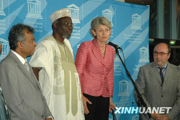 9月22日,在法国首都巴黎,被提名为联合国教科文组织下任总干事候选人的博科娃(右二)向媒体发表讲话。当日,联合国教科文组织执行局在巴黎就下届总干事提名人选进行了第五轮投票,结果保加利亚前外交部长伊琳娜·博科娃胜出,成为唯一候选人。她将由下月举行的第35届联合国教科文组织大会批准成为新任总干事。新华社记者李学梅摄