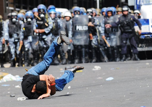 9月23日,在洪都拉斯首都特古西加尔巴,一名抗议者与警察对抗。