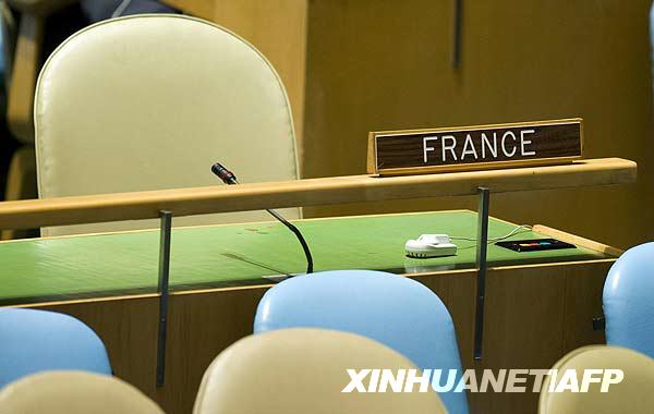 9月23日,在美国纽约举行的联合国大会上,伊朗总统艾哈迈迪-内贾德发言时法国代表团的座位上空无一人。新华社/法新