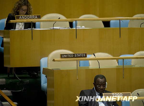 9月23日,在美国纽约举行的联合国大会上,伊朗总统艾哈迈迪-内贾德发言时美国代表团的座位上空无一人。新华社/法新