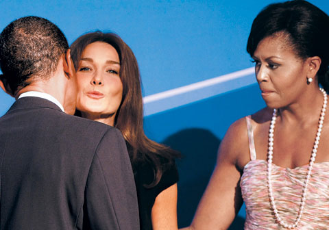 第1张雷人照片是在法国总统萨科齐和第一夫人布吕尼到场时拍摄的。当晚,模特出身的布吕尼身穿一套墨蓝色紧身礼服,她刚一进场就立刻惊艳四座,成为晚宴全场的最大的亮点。显然,奥巴马也被美艳绝伦的布吕尼深深吸引,立即走上前与布吕尼拥抱,并在布吕尼的两侧脸颊各亲吻2次,并对她说:“今天可能没有足够的时间和你聊了。”然而由于奥巴马与布吕尼拥吻的时间太长,他身旁的夫人米歇尔只好在一旁茫然若失地等待。照片显示,米歇尔当时满脸不悦而且神色紧张,仿佛打翻了醋坛子!