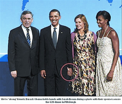 这一非同寻常的举动让许多记者惊得目瞪口呆,据悉,当晚奥巴马在和其他国家元首及夫人合影时均只是简单地摆个姿势,没有牵住任何一个人的手!英国《每日邮报》戏称,当英国首相布朗下令释放“洛克比空难爆炸案”的主谋之后,就不断有报道称美国政府对此十分愤怒,但“奥巴马和布朗夫人萨拉紧紧扣住双手,却向世人证明英国和美国之间的关系仍‘牢不可破’”。