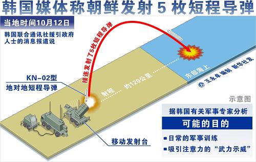 新华网首尔10月12日电(记者 班威 姬新龙)据韩国媒体报道,朝鲜12日在东海岸地区发射了5枚移动式地对地短程导弹。