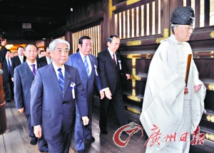 10月20日上午,包括日本众院副议长卫藤征士郎在内的54名“超党派”人士,“效仿”谷垣祯一公然集体参拜靖国神社。