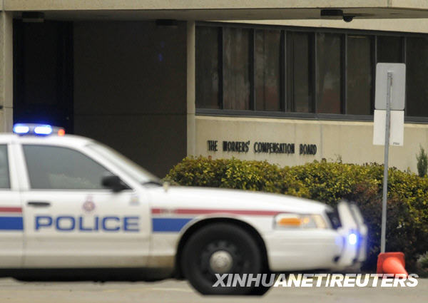 10月21日,一辆警车停在加拿大西部城市埃德蒙顿市工人赔偿委员会大楼外。当天上午,一名男子手持步枪闯入该市工人赔偿委员会大楼,劫持了数名人质。新华社/路透