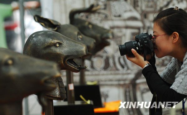 10月16日,一位市民在拍摄展出的兽首。当日,古法再造“圆明园十二生肖兽首”在安徽合肥举行的第三届全国文化纪念品博览会上亮相,吸引了市民们前来参观。新华社记者 李健 摄