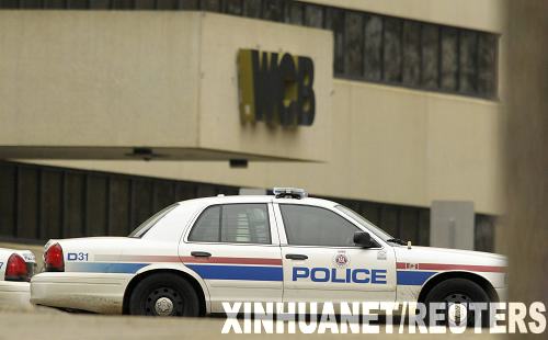 10月21日,一辆警车停在加拿大西部城市埃德蒙顿市工人赔偿委员会大楼外。当天上午,一名男子手持步枪闯入该市工人赔偿委员会大楼,劫持了数名人质。 新华社/路透