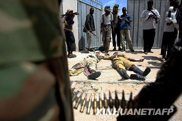 2009年7月13日,在索马里首都摩加迪沙,反政府武装聚集在交火中被打死的2名警察周围。索马里政府军12日在首都摩加迪沙北部与反政府武装交火,击毙40名反政府武装人员。政府军死亡3人。新华社/法新