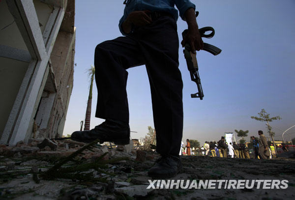 10月23日,在巴基斯坦西北边境省首府白沙瓦,警察在爆炸现场附近警戒。当日下午,白沙瓦一家餐馆附近发生汽车炸弹爆炸事件,造成至少15人受伤。 新华社/路透