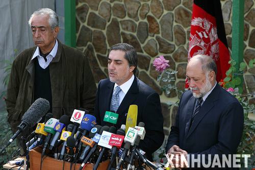 10月21日,阿富汗总统候选人阿卜杜拉(中)在阿富汗首都喀布尔出席新闻发布会。当天,阿卜杜拉宣布拒绝与现任总统卡尔扎伊组成联合政府,并呼吁总统选举第二轮投票坚持公平、公正。新华社发(扎比摄)