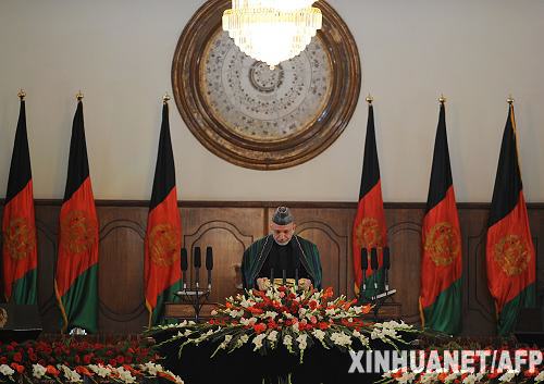 11月19日,在阿富汗首都喀布尔的总统府,阿富汗总统卡尔扎伊宣誓就职,开始其第二个5年任期。新华社/法新