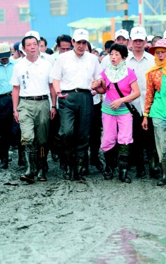屏东县林边灾区仍泥泞不堪,马英九昨天踩着淤泥勘灾,要求台军官兵一星期内将淤泥清完 。图片来源:台湾《联合报》