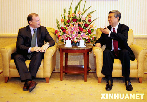 10月8日,新华通讯社社长李从军(右)在北京饭店会见英国广播公司(BBC)全球新闻总裁山姆布鲁克。新华社记者张铎摄