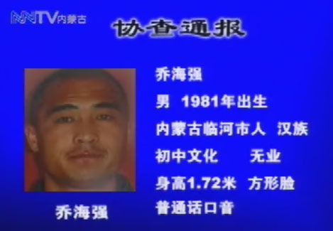姓名:乔海强 男 1981年出生 内蒙古临河人 汉族 初中文化 无业 身高1.72米 方形脸 普通话口音