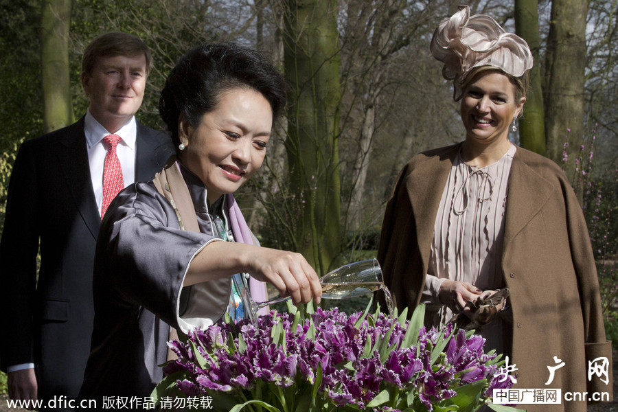 当地时间2014年3月23日,荷兰库肯霍夫城堡,威廉-亚历山大国王与马克西玛皇后看彭丽媛为国泰郁金香浇水。3月22日起至4月1日,习近平应邀对荷兰、法国、德国、比利时进行国事访问,对联合国教科文组织总部、欧盟总部进行访问,并出席在荷兰海牙举行的第三届核安全峰会。