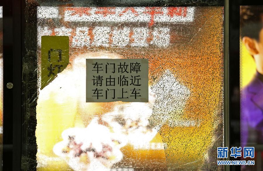 4月15日,事发地点安全门玻璃已经破碎。当日早晨,正处在早高峰期间运行的沈阳地铁1号线遇突发事件,造成多趟列车延误,1号线一度中断通行。截至上午9时,1号线列车行车间隔已恢复正常。目前,涉事人员正在接受警方调查。新华社记者 姚剑锋 摄