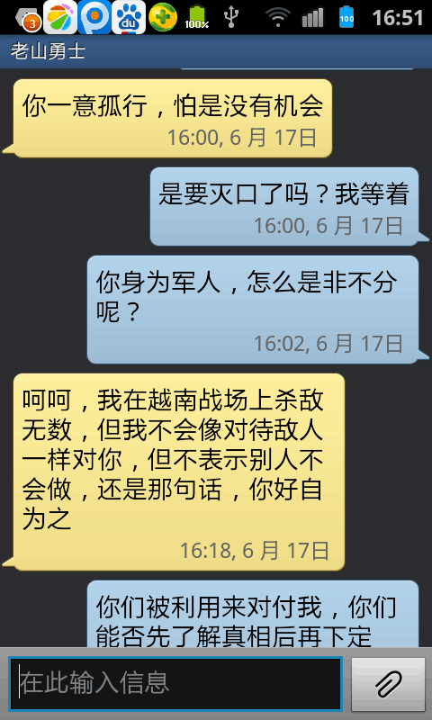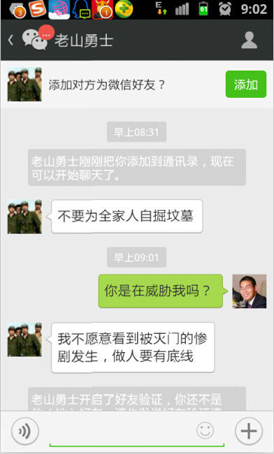 在双方简短的微信对话中,“老山勇士”写道:“不要为全家人自掘坟墓”。赵春雷则回应:“你是在威胁我吗?”