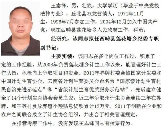西畴县党建网公布的王志锋的拟任职照片。