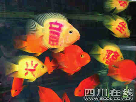 “咦,老板,你这个鱼身上还有字啊?”昨日上午,市民李先生在成都青石桥宠物市场一家水族馆内,发现4条白色观赏鱼的身上分别写着“生”、“意”、“兴”、“隆”,4个字组成了一幅活动的红字喜联。原来,这些图案是在鱼还是幼小时,用激光打在其身上的,不会掉色。“文身鱼”作为礼品受到不少市民追捧,但也有市民提出质疑。