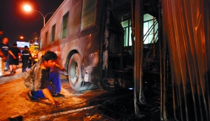 20日晚,工作人员正在对起火车辆进行检查,以便拖走。记者 周晓东 摄