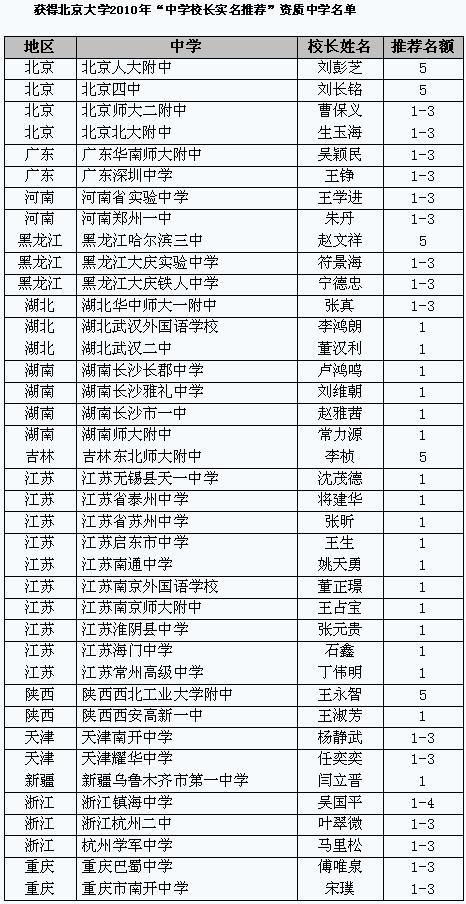 全国39所中学获得北京大学2010年“中学校长实名推荐”资质。北京大学招生办公室16日公布了这39所中学及其校长姓名进行公示。