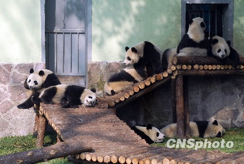 1月18日,10只来自四川卧龙大熊猫保护区的大熊猫幼崽安居在上海动物园新建熊猫场馆内,目前在饲养员照料下适应良好。1月20日,10只世博熊猫宝宝将在上海动物园正式亮相。 中新社发 徐和德 摄