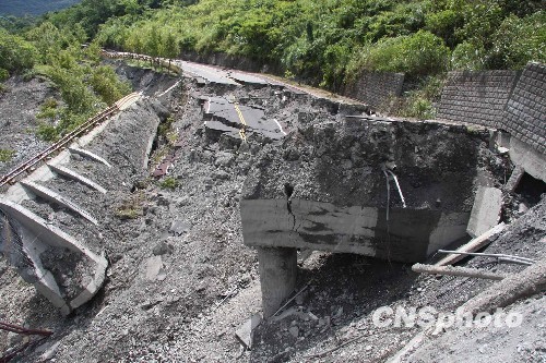 8月11日,中新社记者继续涉险踏访台东县水患重灾区,所见所闻、令人震撼。图为延平乡松枫大桥与公路联结处,被冲垮、斜坠溪谷,“莫拉克”台风及洪水爆发的破坏力令人匪夷所思。 中新社发 董会峰 摄