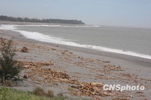 “莫拉克”台风远离,但所引发的“88水灾”为台湾近50年来仅见,图为重灾区之一的旅游胜地台东县,海边绵延数十公里堆积漂流木,“沙滩变成木滩”,连海水也变色。 中新社发 董会峰 摄