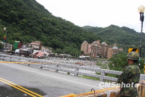 重灾区之一的台东县知本温泉区,一名士兵在桥畔守望断楼。 中新社发 董会峰 摄