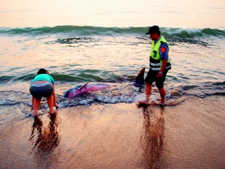 金山派出所昨天清晨5时接获妇人报案,指出水尾沙滩有海豚搁浅。警员郭光明赶到现场察看,发现海豚困在沙滩,腹部擦伤渗血;郭与发现妇人想一起把海豚推回海里,但太重,而且海豚紧张地从喷气孔喷气,两人担心弄伤海豚,不敢再动。