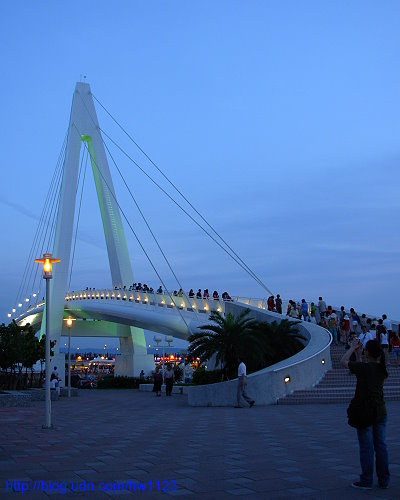 渔人码头也是近几年崛起的淡水新景点,有「情人桥」美名的跨港大桥于2003年2月14日情人节落成,拥有优美的造型及绝佳的观海视野,是渔人码头最美丽的地标,我常在看完落日后,夜色将掩时再看一眼暮色里的白桥灯景,将渔港影堤留作离去前的最佳回忆。