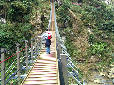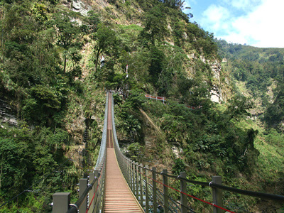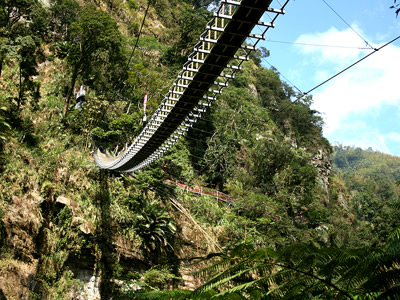 穿过茂密的竹林与步道后,就可以抵达天梯,站在梯子吊桥桥头上,放眼望去及尽是裸岩峭壁、瀑布奔流的风光,可媲美花莲太鲁阁美景,因此有有“西部太鲁阁”的美称,而连接两岸的梯子吊桥,在半空中形成一道美丽的弧线,走在桥上,有种置身于天地之间的浩然气势、腾云驾雾的感觉,视野景观相当独特。值得一提的是,天梯桥下有一处“梯子岭土地公”,也常吸引游客到此地祈福,也是梯子吊桥的特殊景点之一。 (来源:大台湾旅游网)