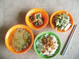 来吃鸡肉饭的客人,总会再配个卤白菜、油豆腐,甘兰菜或笋丝等小菜,再叫碗味噌汤。最近原物料飙涨,清美鸡肉饭坚持不涨价,每碗仍卖25元(新台币)。一餐吃下来,不超过60元。很多外食族,就是喜欢清美鸡肉饭的「简食、乡土」。