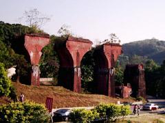 龙腾断桥:山线铁路自苗栗站南下,过胜兴后约两公里处的龙腾溪上,几座造型俊美的擎天残柱,矗立铁路东侧的荒烟漫草中,古意盎然,那是令老一辈乡民,心有余悸的台湾中部大地震残留痕迹龙腾断桥。那次大地震,震央在关刀山附近,巍峨的山线铁路龙腾溪桥,完全震毁,震后,在原桥的西侧,另建新桥,遗下拱型桥柱,挺立在烈日风霜里,供后人凭吊。这座断裂的红砖拱桥系日本人一九○五年左右所建,当年建造此桥的师傅均为请自内地广东,日本人对品质管理极为严格,整座桥纯由红砖水泥所砌成无半截钢筋,但结构却非常严密而牢固。早年民生疾苦,运输不便,当地居民目睹因地震断落的红砖桥梁可资利用,纷纷欲敲打一些砖块回家做砌墙建屋之用,可是往往敲打整日却仅获十数块完好者而已,由此可见该桥坚固之一般,这也是该断桥虽历经百年之久,尚能屹立不倒的原因之一。