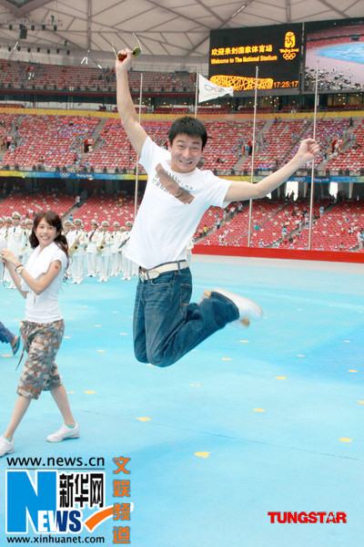 24日中午,各组艺人到集合地点进行安检,此时英国足球明星贝克汉姆一行也进行安检,看到贝克汉姆,一众明星都感到非常兴奋。一行人浩浩荡荡抵达鸟巢准备彩排时。导演张艺谋特地过来感谢大家支持,张导演一看到华仔便和华仔热情拥抱,华仔率先恭喜张艺谋导演执导出成功的奥运开幕式。