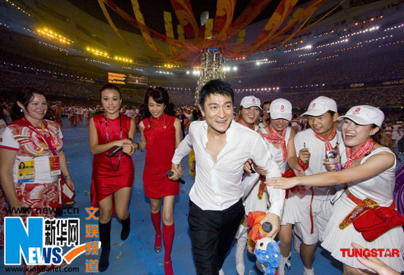 当知道自己演唱的那一段会有世界各地运动员加入在台下一起狂欢,华仔想应可以看到高人一等的“移动长城”姚明,但却没看到。闭幕式就像一个欢乐的大party,众星在台上也唱得特别high,莫文蔚不小心险从高台跌下,幸得眼尖的华仔赶紧抓住她,将她拉起来。莫文蔚走回后台时还心有余悸,她对华仔说:“真的好惊,华仔谢谢你救我。”当莫文蔚拉下长袜才发现小腿有大片瘀血,一只脚还流血。华仔先帮莫文蔚消毒,再请工作人员拿冰块帮她敷。