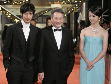 Taiwan actor Wang Lee-hom (L), director Ang Lee (C) and Chinese mainland's actress Tang Wei pose as they arrive on the red carpet for the 44th Golden Horse Awards in Taipei Dec. 8, 2007. [Agencies] |