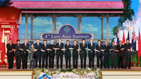 Leaders pose for photos for the 4th East Asia Summit (EAS) in the southern Thai resort town of Hua Hin, Oct. 25, 2009. The 4th East Asia Summit (EAS) opened here on Sunday, where ASEAN (Association of Southeast Asian Nations) leaders and their counterparts from China, Japan, South Korea, India, Australia, and New Zealand met to discuss regional cooperation topics. (Xinhua/Pang Xinglei)
