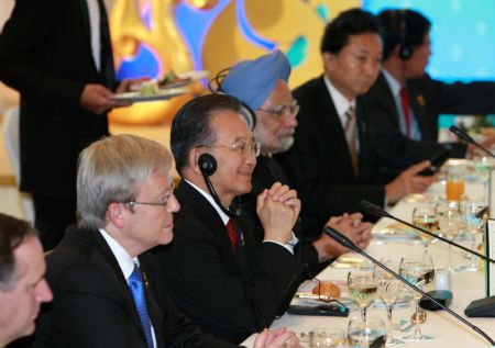 Chinese Premier Wen Jiabao attends the 4th East Asia Summit (EAS) in the southern Thai resort town of Hua Hin, Oct. 25, 2009. The 4th East Asia Summit (EAS) opened here on Sunday, where ASEAN (Association of Southeast Asian Nations) leaders and their counterparts from China, Japan, South Korea, India, Australia, and New Zealand met to discuss regional cooperation topics.(Xinhua/Liu Weibing)